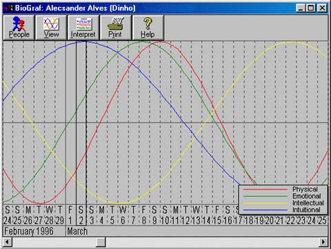 Na noite do dia 2 de Março de 1996, o Brasil foi abalado com a notícia do acidente aéreo que matou todos os componentes do grupo musical "Mamonas Assassinas", que alcançou um sucesso de público e vendas de discos até então inédito, em apenas 6 meses de carreira. No gráfico acima, analisamos as curvas do Bio-Ritmo do líder da banda, Alecsander Alves, o "Dinho", nascido em 05 de Março de 1971 (ou seja, faleceu 3 dias antes de seu 25.º aniversário). O Ciclo Emocional estava Crítico, enquanto o Físico e o Intelectual Negativos. A análise do piloto e co-piloto não foi possível, por não dispormos das respectivas datas de nascimento, bem como os demais músicos. Mas pelo que conhecemos até o momento, com certeza seus gráficos também não estavam "num dos melhores dias"...